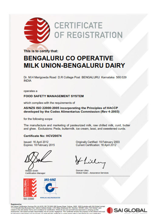 BAMUL is certified for Food Safety Management System, ISO 22000:2005, by M/s Standards Australia International Global, Mumbai.